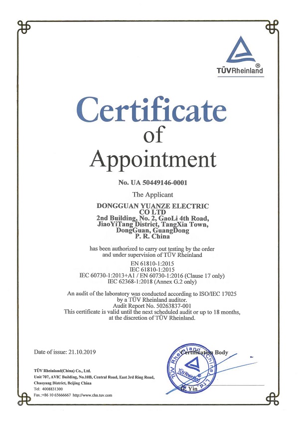 在元則繼電器全體同仁的共同努力之下,元則繼電器于2019年10月28日順利獲得萊茵檢測認證服務(中國)有限公司的TUV認證官方授權。